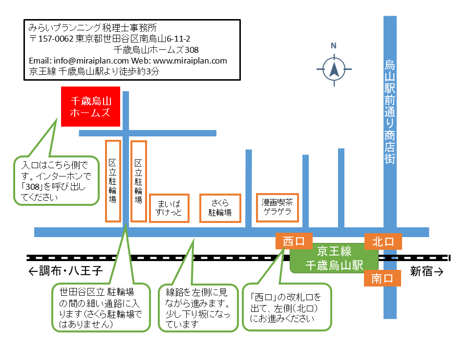 千歳烏山駅では「西口」(新宿から来たときは進行方向)の改札口を出て、左の「北側」に進みます(北口改札と間違えないでください、西口改札の北側です)。
